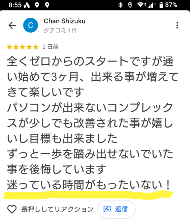 無料体験を終えて入会を決めたお客様が言うのには…「私、他所のパソコン教室の体験にも行ってるんですが、ここがず~っと気になっていたんですよ。やっぱり、全然違いますね」ありがとうございます。そう言って戴けると本当に嬉しいです!体験すれば分かって頂けます<(_ _)>