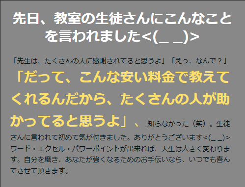 ワード・エクセル・パワーポイントが出来れば、人生は大きく変わります。自分を磨き、あなたが強くなるためのお手伝いなら、いつでも喜んでさせて頂きます。