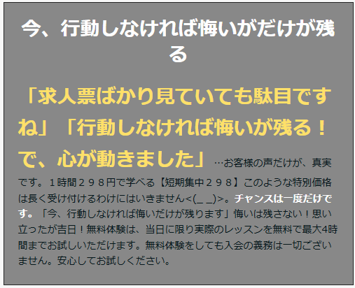 「求人票ばかり見ていても駄目ですね」「行動しなければ悔いが残る!で、心が動きました」…お客様の声だけが、真実です。1時間298円で学べる【短期集中298】このような特別価格は長く受け付けるわけにはいきません<(_ _)>。チャンスは一度だけです。「今、行動しなければ悔いだけが残ります」悔いは残さない!思い立ったが吉日!無料体験は、当日に限り実際のレッスンを無料で最大4時間までお試しいただけます。無料体験をしても入会の義務は一切ございません。安心してお試しください。